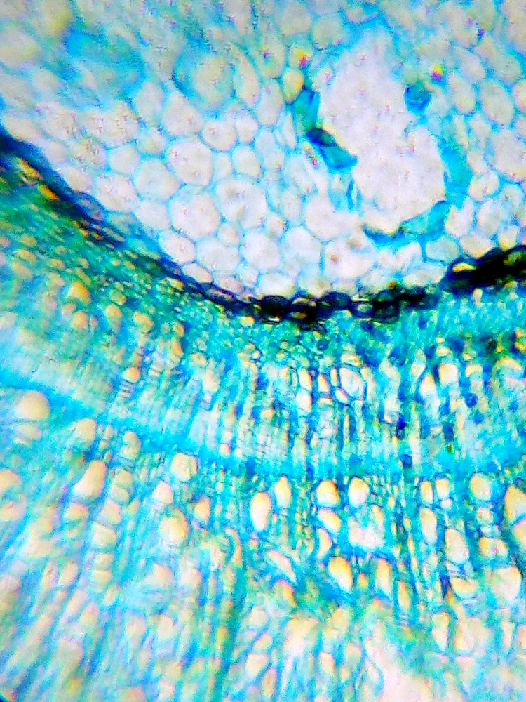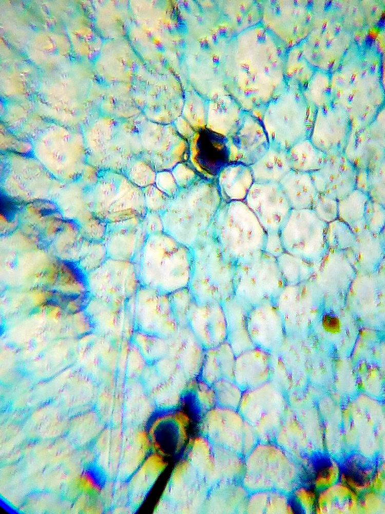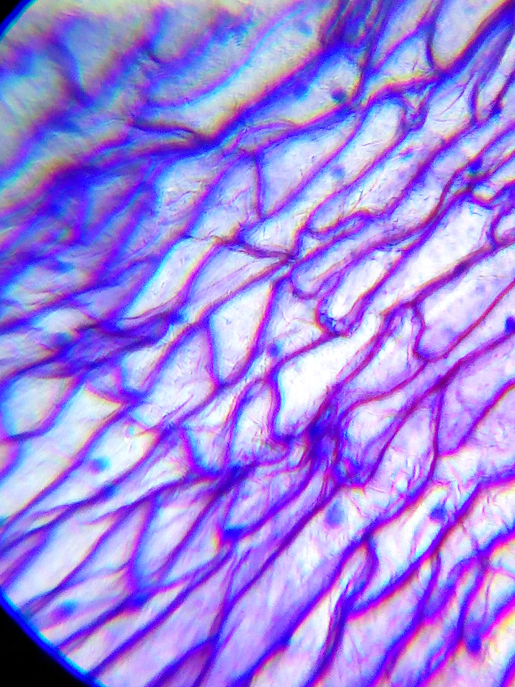 Этот микроскоп подходит для изучения объектов на просвет. На круглый предметный столик помещают образец, например прозрачный срез лука или комнатного цветка. Чтобы препарат не сбился при неосторожном движении, его фиксируют двумя зажимами. Свет от нижней подсветки проходит сквозь микропрепарат, и в окуляре появляется его увеличенное изображение. Для разных препаратов нужно разное освещение, поэтому яркость подсветки легко регулируется.